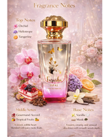 This perfume opens with a radiant trio of Orchid, Heliotrope, and Tangerine, creating a bright, floral-fruity lift. The heart bursts into a delicious mix of Gourmand notes wrapped in Tropical Fruits, giving it a mouthwatering, playful charm. As it settles on the skin, rich Vanilla, soft Musk, and smooth Sandalwood come alive, creating a warm, addictive finish. A signature scent that is sweet, exotic, and undeniably unforgettable.