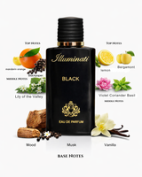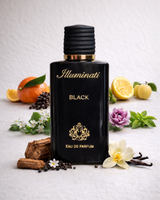 Illuminati Black begins with a bold fusion of orange zest, pineapple, and refreshing green notes, lifted by bright hints of lemon and grapefruit. The heart unfolds into a magnetic blend of apple, blackcurrant, jasmine, and patchouli, bringing freshness, fruitiness, and subtle sensuality. The scent dries down to a powerful base of warm amber, musk, vanilla, vetiver, cedarwood, and earthy oakmoss, creating a striking and long-lasting signature.