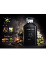Opal Noir is a bold, seductive, and intensely masculine fragrance with a dark, luxurious edge. It opens with crisp fig and spicy cardamom, creating an intriguing and refined first impression. The heart blends rich leather, aromatic jasmine sambac, and earthy nuances, adding power and sensuality. In the base, warm amber, deep moss, and smooth patchouli create a long-lasting, smoky–woody finish. Opal Noir is ideal for men who prefer strong, confident, and unforgettable scents.
