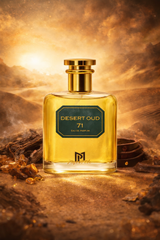 DESERT OUD 71 is a bold and captivating fragrance inspired by the mystery of the desert. It opens with spicy and smoky accords, evoking warmth and intensity. The heart reveals rich oud blended with earthy woods and soft florals, creating depth and harmony. Finally, golden amber, musk, and leather form a lingering base of strength and sophistication. Encased in a golden-capped bottle, DESERT OUD 71 embodies power, elegance, and timeless allure
