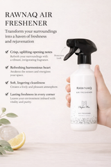 RAWNAQ AIR FRESHENER by Perfect Mix refreshes your surroundings with a vibrant, invigorating fragrance. It opens with crisp, uplifting notes that awaken the senses and energize your space. The heart reveals a harmonious blend of refreshing accords, creating a lively and pleasant atmosphere. Finally, a soft, lingering scent leaves every corner imbued with cleanliness and vitality. RAWNAQ AIR FRESHENER transforms any environment into a haven of freshness and rejuvenation
