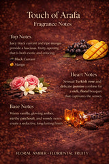 Touch of Arafa is a luxurious 10–12 hour lasting fragrance that blends the romantic depth of Turkish rose and jasmine with the fruity richness of black currant and mango. Warm vanilla and amber add softness and sensuality, while patchouli and woody notes create depth and elegance. Rich, captivating and beautifully refined, it leaves an unforgettable, enchanting trail.
