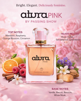 Passing Show Atura Pink Eau de Parfum is a luminous fragrance that embodies elegance and playful charm. It begins with a sparkling fusion of Mandarin and Raspberry, uplifted by Orange Blossom and a hint of Cinnamon. At its heart, romantic Rose and soft Violet intertwine with the warmth of Sandalwood and Cedarwood, creating a refined depth. The base lingers with the sweetness of Vanilla and Biscuit, enriched by Benzoin and the sensual caress of White Musk, leaving a lasting impression